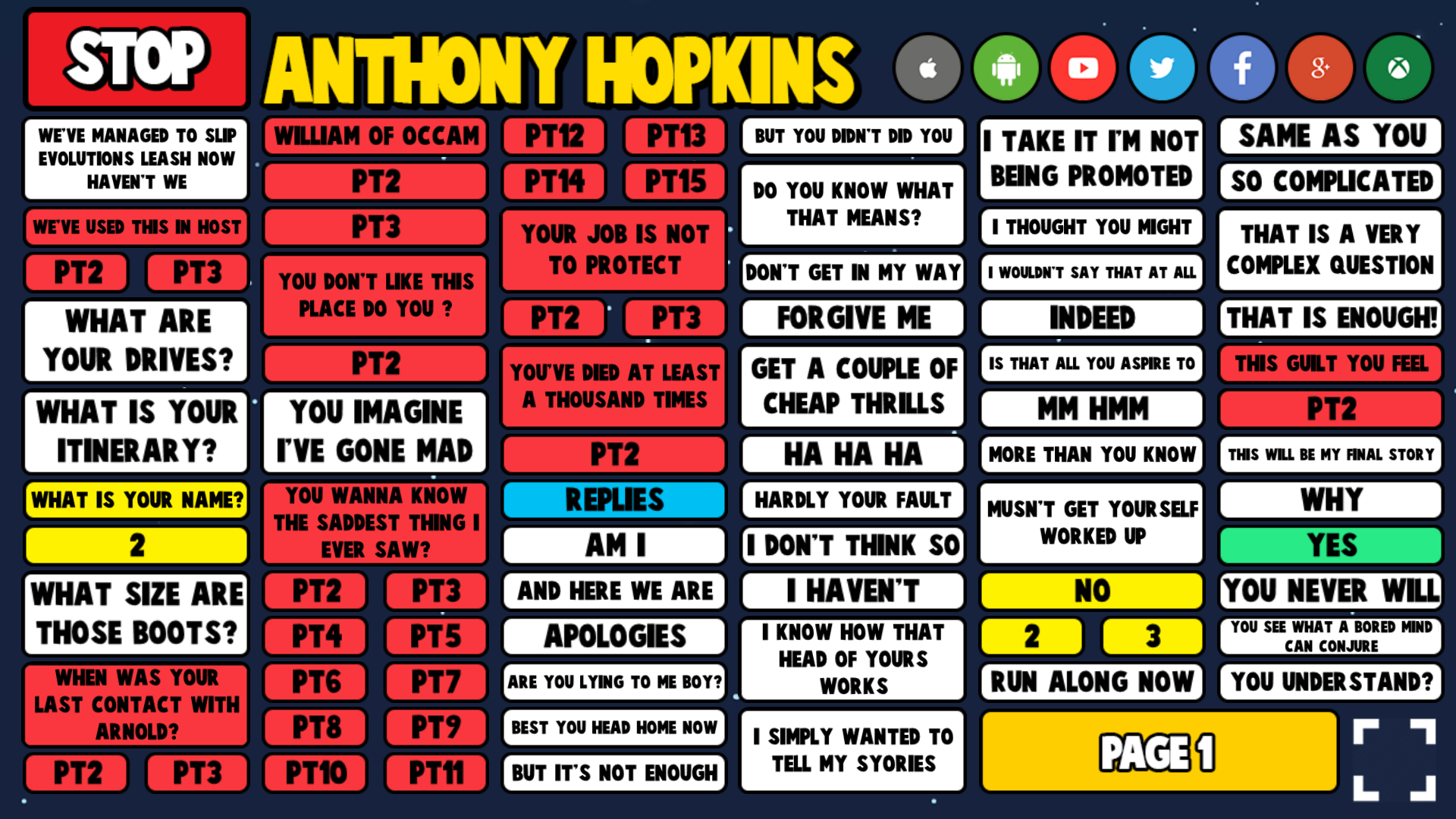 ANTHONY HOPKINS ADDED → Anthony Hopkins soundboard AKA Dr Robert Ford with over 200 of his best quotes all from the TV show Westworld Preview